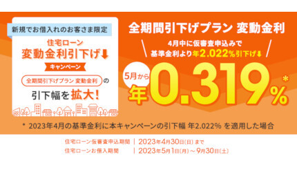 auフィナンシャルグループのauじぶん銀行は、従来より基準金利からの引き下げ幅を拡大した「新規借入限定 住宅ローン変動金利引き下げキャンペーン」を開催している。2023年4月30日までに新規で住宅ローン仮審査を申し込み、5月1日~9月30日に融資実行すると、4月14日現在の基準金利から年2.022%引き下げ、適用金利は5月から年0.319%となる。さらに、住宅ローンの適用金利から最大で年0.1%引下げとなる「au金利優遇割」適用時は年0.219%となる。