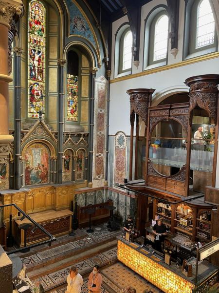 教会のステンドグラスや絵画はそのままだが、1階と2階部分が改装されフードコートになっているメルカート・メイフェア