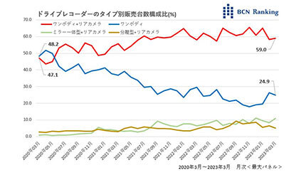 ここ数年のドラレコのタイプ別販売台数構成比を見ると、20年3月では1つの筐体で全部を賄う「ワンボディ」型の構成比が48.2%だった。一方、リアカメラが付属する「ワンボディ+リアカメラ」タイプが47.1%とほぼ半々だった。しかし、ワンボディ+リアカメラタイプの比率が拡大。この3月では59.0%と6割水準に達した。あおり運転対策などを考えると、前方だけでなく後方も記録したいというニーズが高まっているからだろう。平均単価はワンボディタイプが1万2000円前後であるのに対し、ワンボディ+リアカメラタイプは1万9000円前後。価格がおよそ1.5倍のワンボディ+リアカメラタイプが平均単価上昇をけん引している。