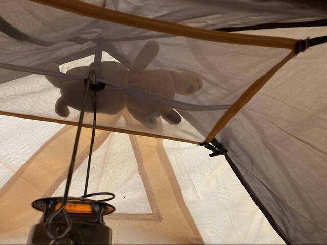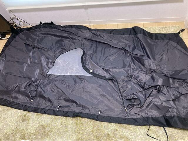 テントの中に入って、天井にメッシュシートを取り付けます。このメッシュシートに小物などを置いたりできます。