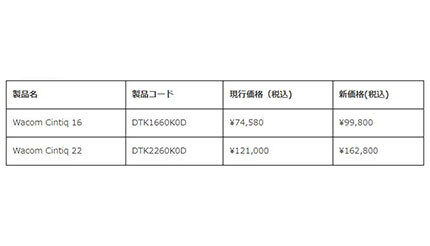 価格改定の対象は、「Wacom Cintiq 16」と「Wacom Cintiq 22」の2機種で、「Wacom Cintiq 16」(改定前の価格は7万4580円)が9万9800円、「Wacom Cintiq 22」(改定前の価格は12万1000円)が16万2800円となる。