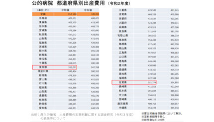 平均出産費用、最安は佐賀の35万円、最高は東京の55万円