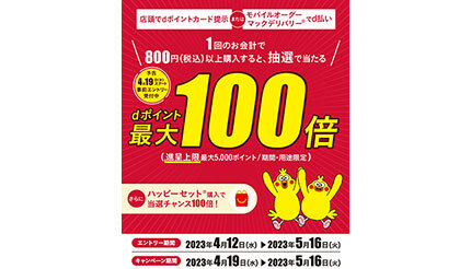 NTTドコモは4月19日~5月16日の期間、日本マクドナルドと共同で、マクドナルドで税込800円以上購入時に所定の条件を満たすと最大100倍のdポイントを抽選で付与する「マクドナルド 抽選でdポイント最大100倍が当たるキャンペーン」を実施する。