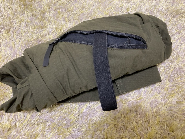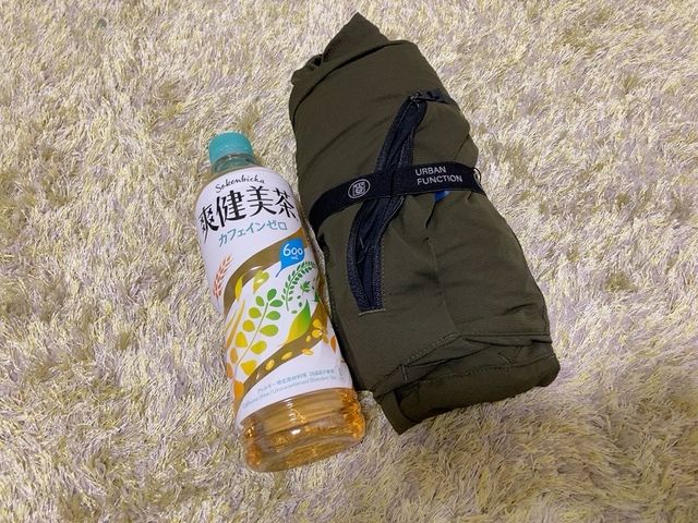 くるくる巻いたパンツをベルトで留めると、ほぼ500mlペットボトルくらいの大きさになりました。
