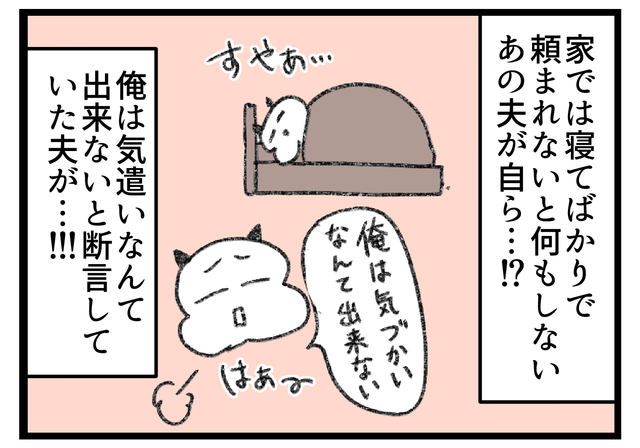 家に居てばかりだったために夫の気遣いに触れて「気遣い、出来るんやん…家でもやってくれて良いのにな…」と思ってしまったのでした。
