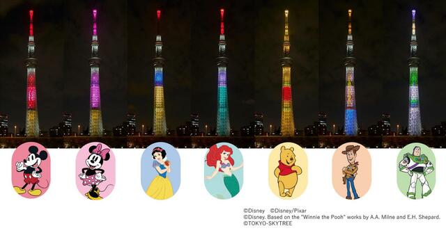 夜になると、東京スカイツリーがディズニーの特別カラーにライトアップされます。