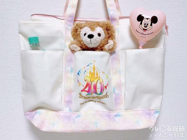 パークグッズなら手持ちバルーンもちょうど良く納まり、パペットくらいのぬいぐるみをカンガルーみたいに入れるのも可愛い。