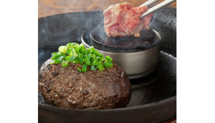 看板メニュー「極味や薪火焼ハンバーグ」は、表面のみ焼き上げられた状態で提供し、1口サイズに切り分けつつ好みの焼き加減で楽しめる。九州産の黒毛和牛と国産牛を独自の配合でブレンドし、玉ねぎや卵といった「つなぎ」を極限まで減らすことによって、約95%を肉が占める他店にはない「肉々しさ」を実現している。