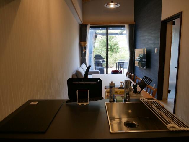 天井が高く解放的な空間の一角には、和ベッドが備えつけられた寝室。そこから繋がるようにダイニング、そしてミニキッチン。デッキに向かう手前には、大きなテレビとゆったりくつろげるソファもあります。