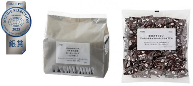 左から「マイボトル用コーヒーバッグ」「苦味のすくないアーモンドチョコレート カカオ72%」