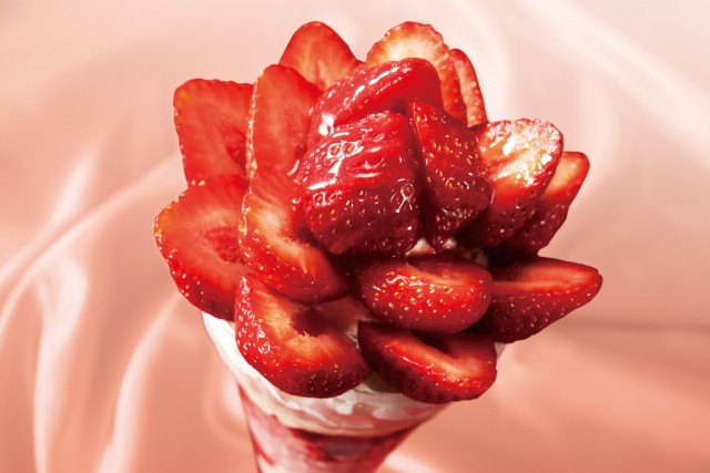 「あまおうプリンセスサンデー」は、赤くてツヤのある大粒の「博多あまおう」を贅沢に10粒分使用した特別なサンデーです。クリームやソース、ゼリー、ソルべと、まさに苺づくしの華やかなたたずまいは、まさにプリンセス。あまおうの美味しさと、苺の魅力を存分に感じていただける一品となっています。