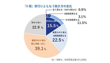 「2割程度異なる」(22.5%)も含めると、「5類」への移行後の働き方が新型コロナ禍前と異なる企業は38.0%に達している。