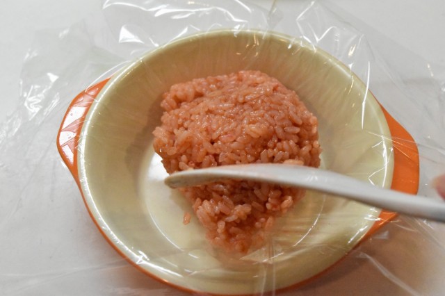 チキンライスのように具を入れたいところですが、顔のバランスが悪くなるので、もし入れるとしたら、顔の形をラップで形成するときに、おにぎりのように具材を詰めるのもアリだと思います。