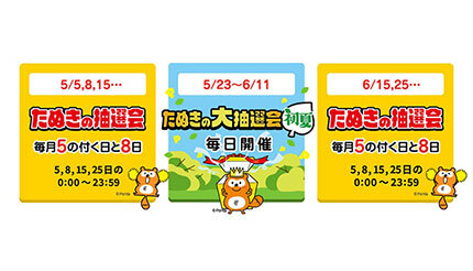 なお、毎月「5」の付く日と「8日」(たぬきの吉日)には、同様に1ポイント以上最大3000ポイント当たる「たぬきの抽選会」を開催しているが、「たぬきの大抽選会 初夏」の期間中は、この「たぬきの抽選会」の対象日が「毎日開催」に拡大するかたちだ。ただし、NewDays、郵便局・簡易郵便局、各調剤薬局、みずほ銀行宝くじ、Suica入金(チャージ)など一部の店舗は対象外。