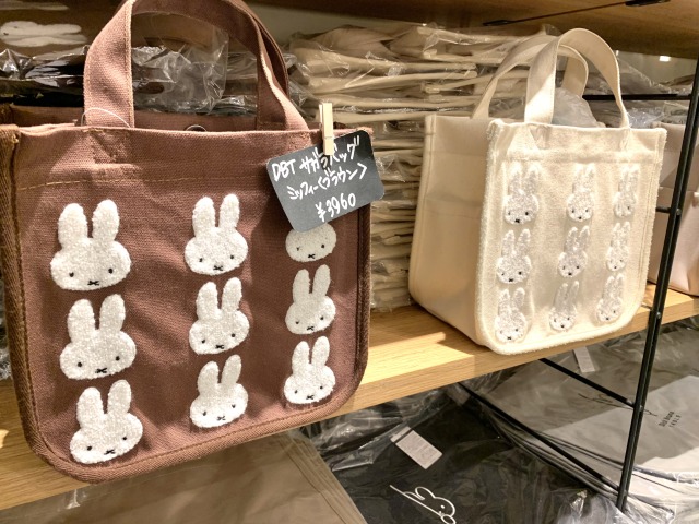 入荷すると即日完売する、ミッフィーとブラック・ベアのサガラ刺しゅうトートバッグの新色のチャコールとベージュなど、新作グッズを先行販売します。