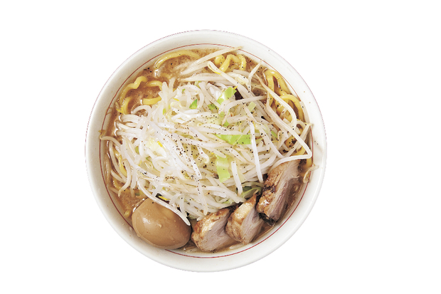 濃厚なスープにもっちりの太麺、チャーシュー、たっぷりのもやしとキャベツがのる様はまさに男盛り。特にスープにはオープン当初から呼びもどして使用するなどのこだわりを見せる。