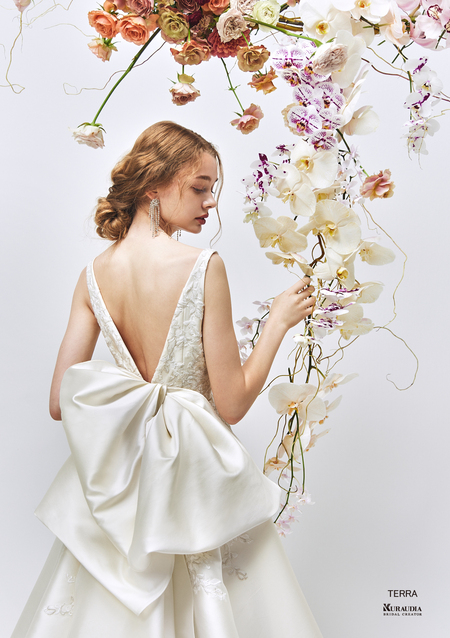 品よくざっくり空いた背中、シルクのビックリボン、シルバー糸入りのリーフ柄チュールレースなど、ときめく可愛さが満載!
