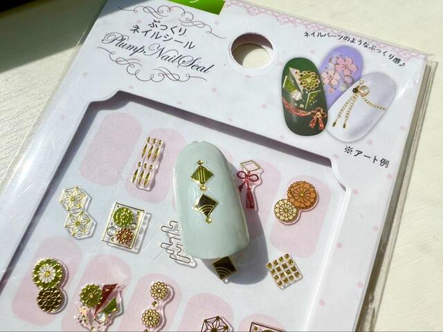 2つ目は「ネイルシール ぷっくり モダン(YE11141)」の緑色ベースをご紹介します。