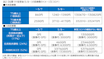また「医療費の自己負担」では、感染症法に基づく入院措置・勧告もなくなるため、医療費の一部自己負担が生じる。ただし、変更による急激な負担増を避ける観点から、一定の公費支援について期限を区切って継続される(5月8日~9月末迄、10月以降については感染状況等や他の疾患との公平性も考慮して検討される)。