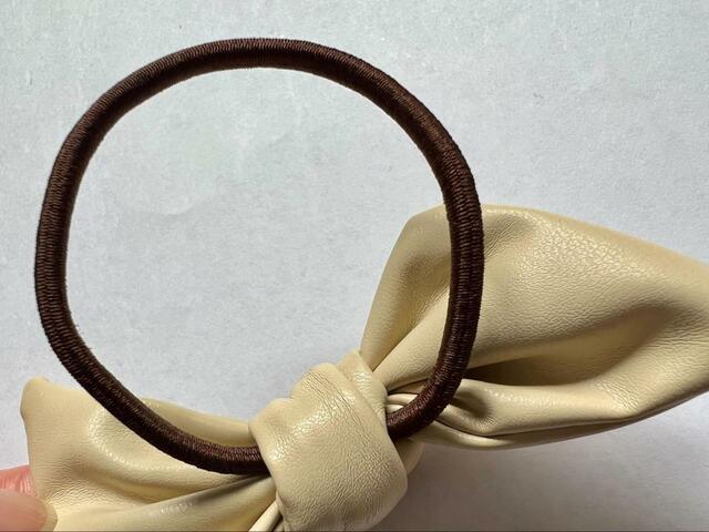 また、素材もレザー風の生地が使用され、リボン自体も一本の布をまる結びしたようなデザインのため、かわいくなり過ぎず、大人の女性でもさりげなく使いやすいデザインです。