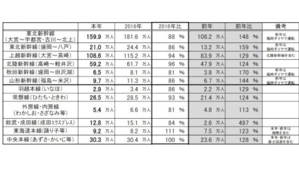 JR東日本はゴールデンウィーク(GW)の期間中(4月28日~5月7日)、新幹線・在来線の利用状況が約378万5000人となった。2018年比で91%、前年比では140%だった。
