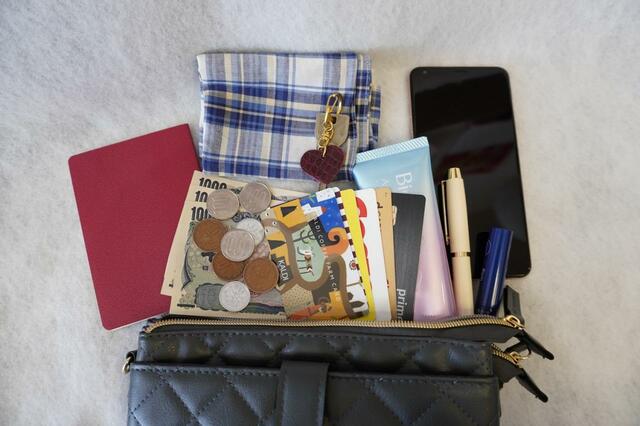 ハンカチ、リップクリーム、鍵、メモ帳、筆記用具、日焼け止めクリームが入りました。