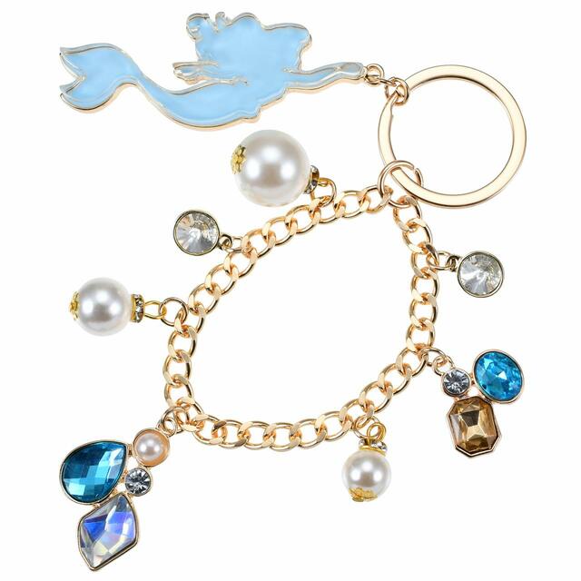 キーアクセサリーは、波や泡を思わせる大小のビジューとパール、そして印象的なアリエルのシルエットが、ゴールドのチェーンについていて、キラキラ美しい海の世界を表現。