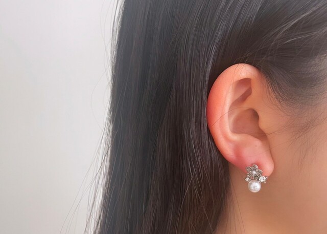 パッと目を引くパールとお花のイヤリング