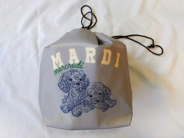 保冷巾着バッグにも、トートと同様に「MARDI」のロゴと、トイプードル2匹のイラストあり。