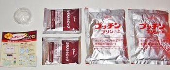 「手作りプッチンプリンのつくりかたガイド」と、プッチンプリンの素、カラメルシロップが2袋ずつ、それに「ミニプッチンプリン」を作る容器が入っている。プリンはこれらが入っていた容器で、1リットルの牛乳を用意すればすぐに作れるようになっているんだ。