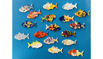 海洋プラスチックゴミ問題は最も身近な課題で、海岸に置き去りにされたペットボトルやさまざまな生活ゴミ、潮に流されて漂着したような外国語ラベルのプラスチックごみも見られるという。特に、シマリエの事務所近くにある海水浴場もマクロプラスチック漂着量が県内ワーストになったこともあったとのこと。美しい海を守り続けるため、数多くの学生や団体、個人がボランティアで日々清掃活動を行っているという。その回収したプラスチックゴミを事務所に集めて、きれいに洗って、細かく切って、それを材料に世界に一つだけの「お魚型キーホルダー」へ生まれ変わらせているとのことだ。
