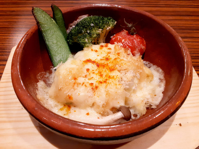じゃがいもとシメジの上にチーズとマヨネーズをたっぷりかけて焼き上げた一品。一緒に焼き上げたスナップえんどうとミニトマトが添えられています。
