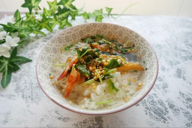 噛み応えのある焼き海老が入った出汁茶漬けです。