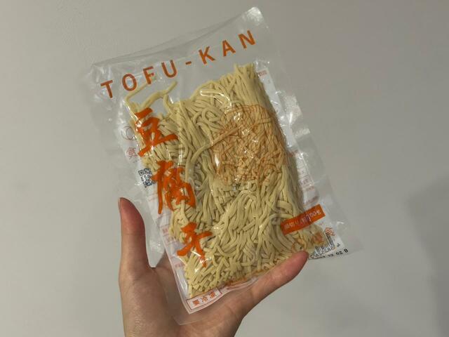 中国で生まれた食材の豆腐干。豆腐に圧力をかけて水分を抜き、しっかりと歯ごたえのある麺状にしたもので、豆腐とは全く違う食感です。