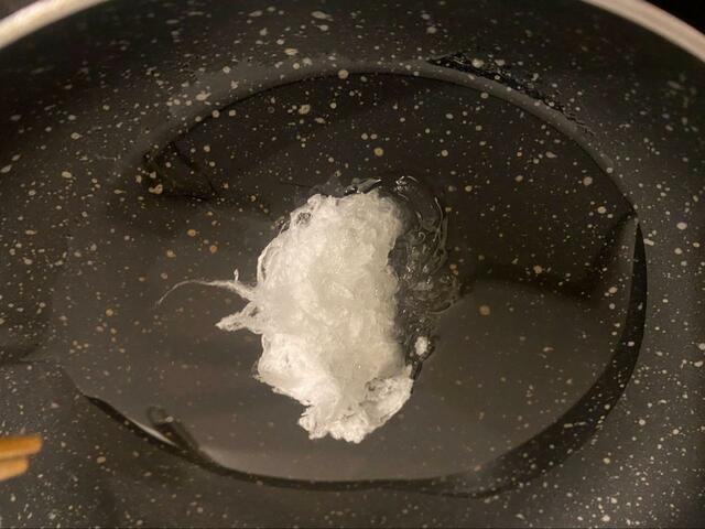 最初にマジカルわたを直径4cmくらいにちぎってフライパンにイン。箸で動かしながら油を吸い取らせると、グングン吸収します!