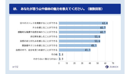 そのほか、自身が思う山や森林の魅力を自由に答えてもらった質問では、「空気が澄んでいる」「さまざまな貴重な動植物を見られる」といった回答が寄せられている。