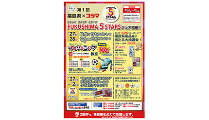 そのほか、「コジマ×ビックカメラ福島店」に加えて「コジマ×ビックカメライオンモールいわき小名浜店」(福島県いわき市)、「コジマ×ビックカメラ会津若松店」(福島県会津若松市)、「コジマ×ビックカメラ方木田店」(福島県福島市)、「コジマ×ビックカメラいわき店」(福島県いわき市)、「コジマ×ビックカメラ白河店」(福島県白河市)、「コジマ×ビックカメラ郡山店」(福島県郡山市)では、5月27日~6月2日の11時~18時に、福島県のプロスポーツを題材にしたクイズラリーを実施する。同イベントでは、店頭にて配布される回答用紙に、店内の各コーナーで発表される福島県のプロスポーツチームに関する問題の応えを記入して、係員に渡すと「FUKUSHIMA 5 STARS」のオリジナルグッズがもらえる。小学生以下が対象で、参加は1名あたり1回のみとなる。