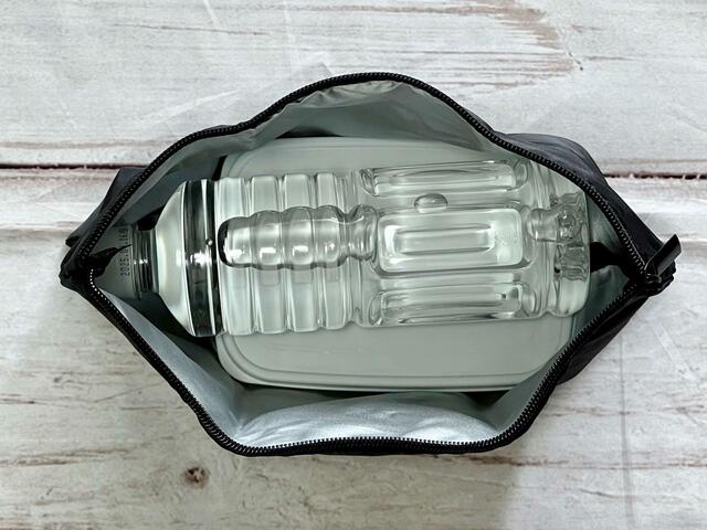 続いてトートバッグに、先ほどの中サイズタッパー&500mlのペットボトル1本が入ったポーチを入れてみたところ…