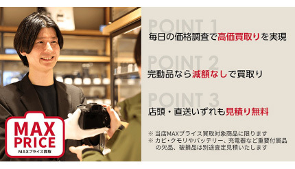MAXプライス買取は、カメラのキタムラ 新宿 北村写真機店の店頭への持ち込み、または専用サイトから直接買い取りを申し込む際に利用可能なサービスで、対象商品のカメラやレンズを査定して状態がAA~Bなら、専用サイト上に表示している価格にて減額なしで買い取る。