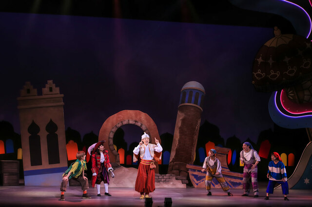 『アラビアンナイト』をテーマにした第一部のミュージカルでは、シンドバットに扮しただいすけお兄さんが「こんにちはー!」とご挨拶。子どもたちも「こんにちはー!」と元気にお返事。