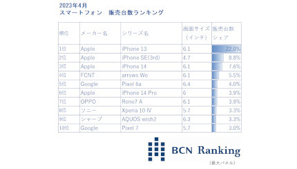 キャリア・カラー・容量を合算したシリーズ別集計で23年4月に最も多く売れたスマホは「iPhone 13」、2位は「iPhone SE(第3世代)」、3位は「iPhone 14」だった。iPhoneシリーズの3月・4月の販売台数は前年同月を下回っており、購入から2年後や2年以内に返却した場合に実質負担が大幅に下がる、一部ユーザーから「レンタル方式」と呼ばれる廉価販売の終了が影響したとみられている。