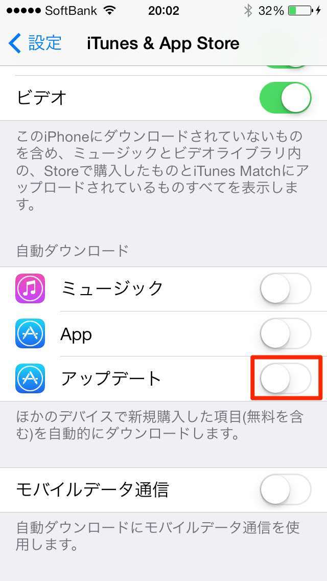 ●「設定」→「iTunes&App Store」から「自動ダウンロード」の「アップデート」をオフ