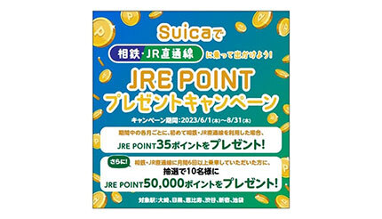 さらに、キャンペーン対象区間を月に6回以上乗車した人の中から、抽選で毎月10人に5万ポイント分のJRE POINTをプレゼントする。