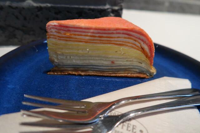 天然色素を利用した「レインボーミルクレープ」は、カラフルなグラデージョンが目を惹き、絶対写真に収めたくなる楽しさが良い。