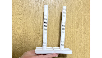 吸湿&脱臭エコドライヤーは、1個売りと2個セットが選べる。筆者が購入したのは2個セットで、スタンドは連結できる仕様だ。
