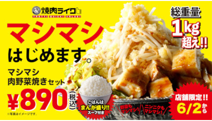 焼肉ライクは6月2日から、梅雨の湿気を忘れさせるようなパワフルな新メニューとして、総重量1kg超えの「マシマシ肉野菜焼きセット」を、恵比寿本店、渋谷宇田川町店、新宿西口店の3店舗限定で販売している。価格は890円。