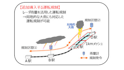 追加導入する運転規制では、1kmメッシュの狭い範囲の雨量を把握できるレーダ雨量を活用することで、局地的な大雨に対応した運転規制が可能になる。具体的には、線路沿線上の1kmメッシュのレーダ雨量が規制基準値を超過した場合、そのメッシュが含まれる区間に対して運転規制を発令する。