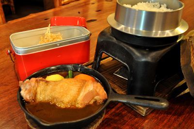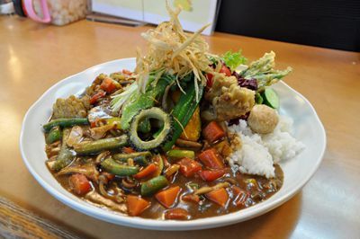 ルーは炒め玉ねぎをオーブンで焦げ目がつかない程度に焼いたものとコンソメがベース。ごはんの具材はナスなど年4回変わる。1日限定20食。