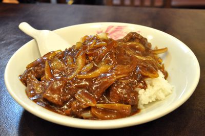 スパイスに、豆板醤、ウスターソース、黒味がかった中国醤油を使い、片栗粉でとろみをつける中華ならではの技法で。牛バラ肉と注文後に炒める玉ねぎをたっぷりと。