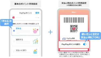 なお、PayPayポイントの利用設定のうち、「貯める」は「PayPay」での支払いや各種キャンペーン特典などで獲得したポイントを貯めておくことが可能で、任意のタイミングでまとめて使える。「運用する」では、手持ちのポイントを自動でポイント運用に追加できる。「支払いに使う」に設定した場合は、「PayPay」での支払い時にポイントを使用する。